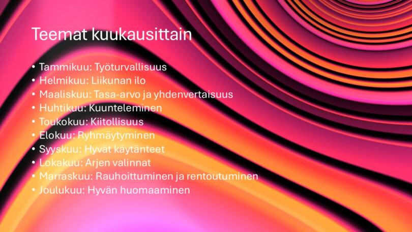 Kurssi on tarkoitettu käytännönläheiseksi työkaluksi. Suunnittelemme yhdessä kurssin aikana omaan työhön sopivan Hyvän mielen vuosikellon.