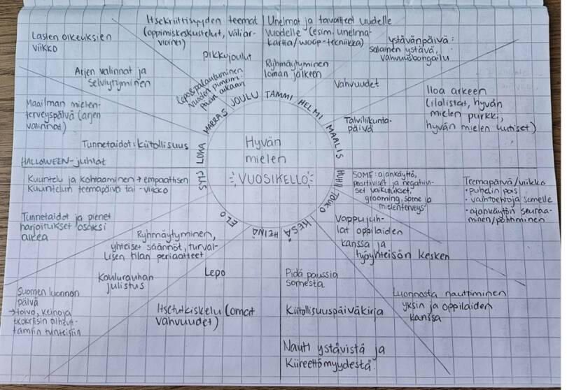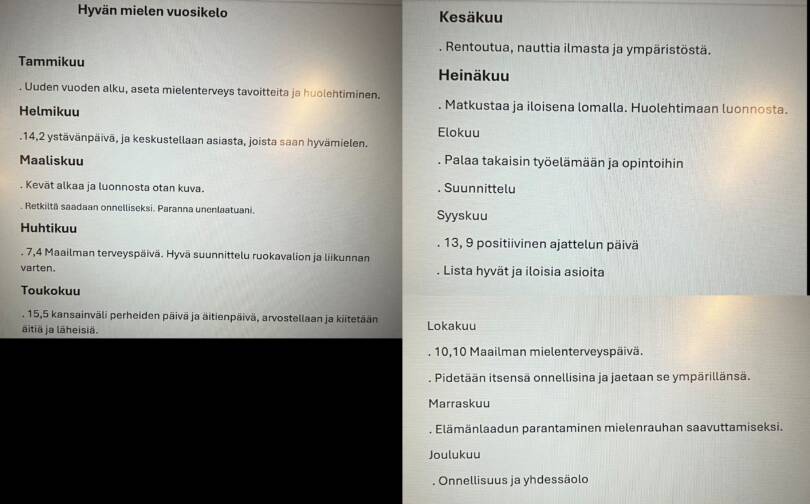 Julkaisemme tekemiänne Hyvän mielen vuosikello-suunnitelmia innoitukseksi kaikille. Löydät kurssilaisten lähettämiä vuosikelloja tältä sivulta alempana.