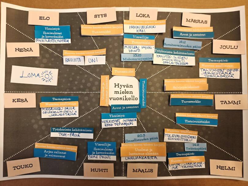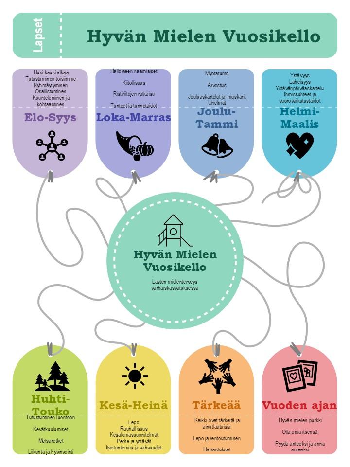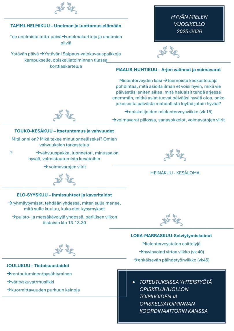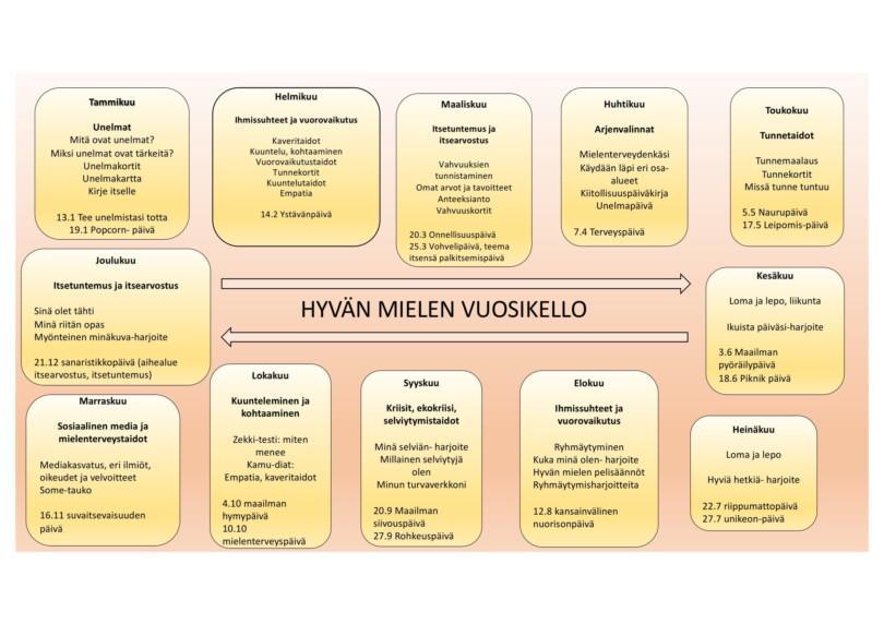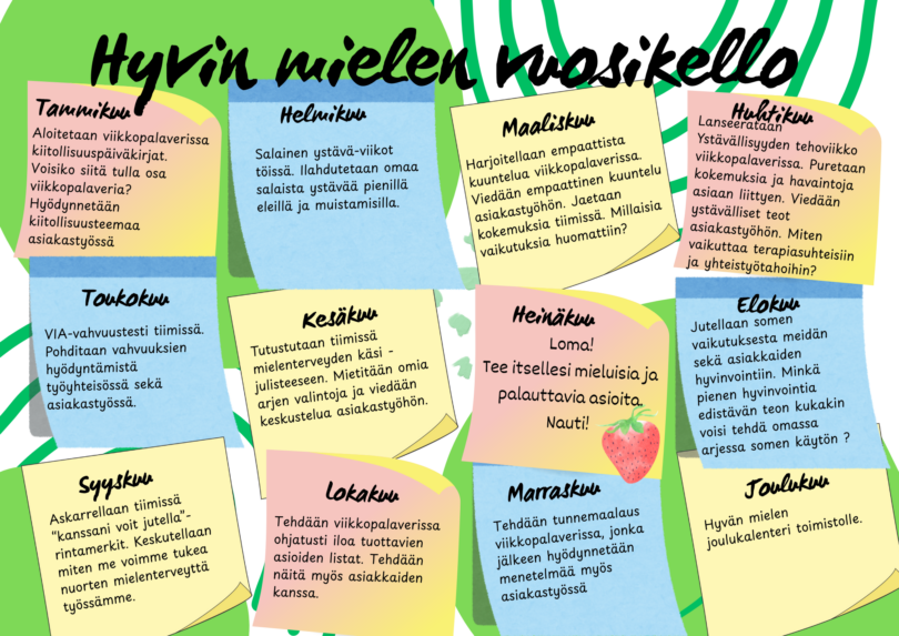 Kurssi on tarkoitettu käytännönläheiseksi työkaluksi. Suunnittelemme yhdessä kurssin aikana omaan työhön sopivan Hyvän mielen vuosikellon.