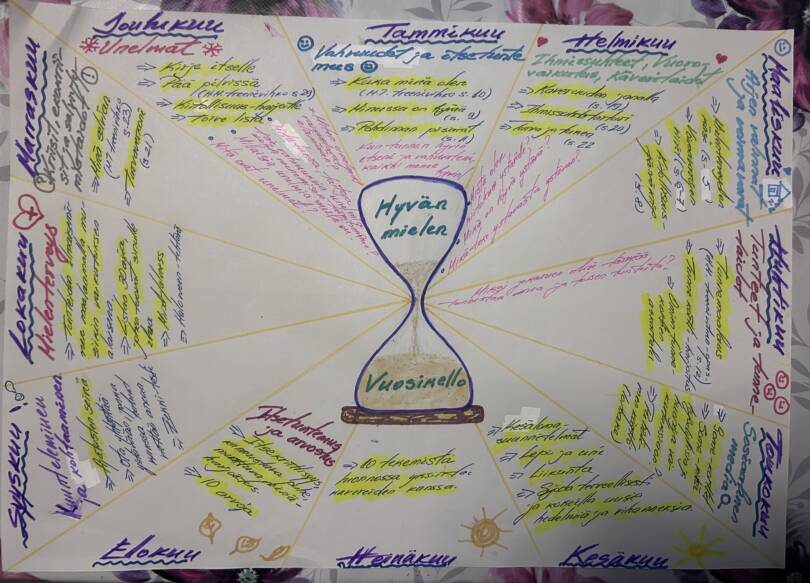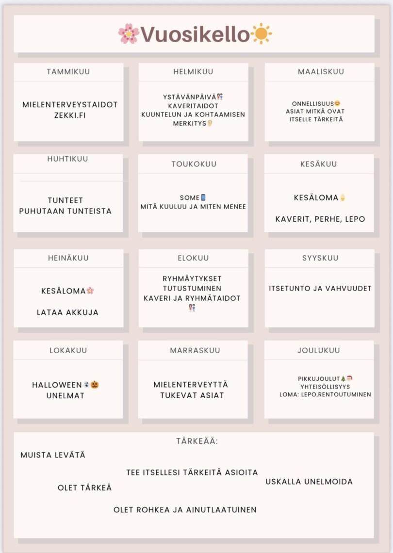 Julkaisemme tekemiänne Hyvän mielen vuosikello-suunnitelmia innoitukseksi kaikille. Löydät kurssilaisten lähettämiä vuosikelloja tältä sivulta alempana.