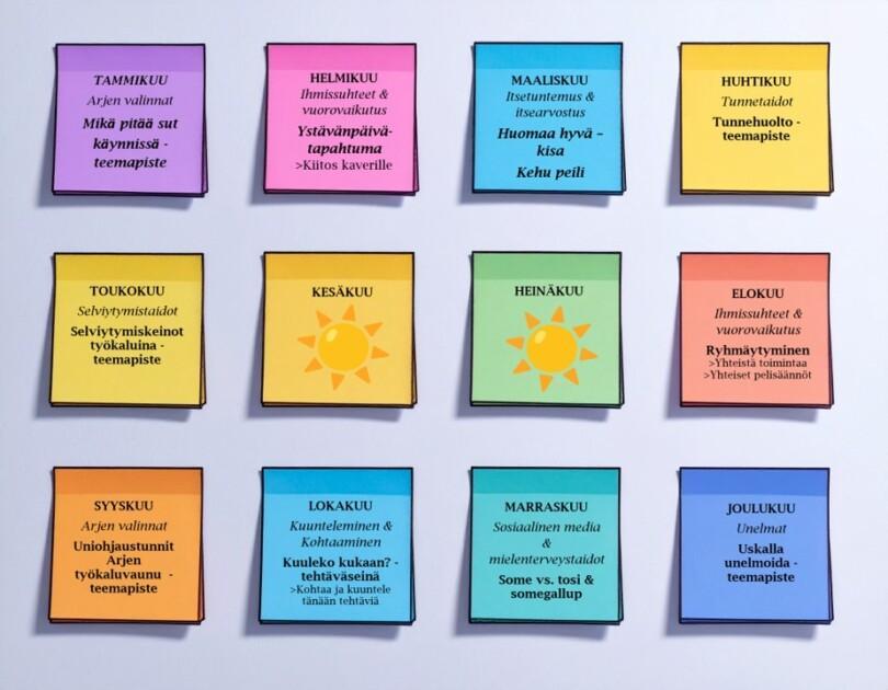 Kuunteleminen. Tässä vaiheessa kevätlukukautta yleensä mietitään seuraavan lukuvuoden asioita: tilataan kirjoja, jaetaan tulevia oppitunteja ja suunnitellaan tulevia teemoja ja painotuksia. Kiireessä usein tulee keskityttyä moneen asiaan yhtä aikaa silloin, kun pitäisi kuunnella kollegaa tai oppilasta. Keskitytään kuuntelemaan toisia. Harjoitellaan esim. Mieli ry:n materiaaleilla hyvän kuuntelemisen taitoa. Aiheesta voi pyytää asiantuntijan luennoimaan. Kuunnellaan ja otetaan huomioon opettajien toiveet uutta lukuvuotta suunniteltaessa ja keskitytään kuuntelemaan, mitä asiaa oppilaalla on.