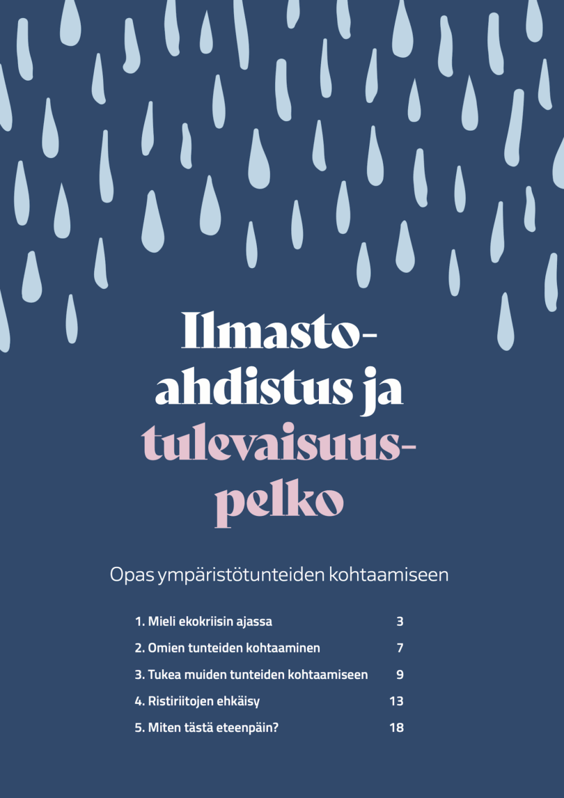 Tämä opas antaa eväitä ympäristötunteiden kohtaamiseen. Alussa on tietoa siitä, miten ympäristö eli ekokriisi vaikuttaa hyvinvointiimme, mielenterveyteemme ja tunteisiimme. Tämän jälkeen siirrytään käytännönläheisiin harjoituksiin, jotka auttavat tunnistamaan ja kohtaamaan ympäristötunteita itsessämme ja muissa.